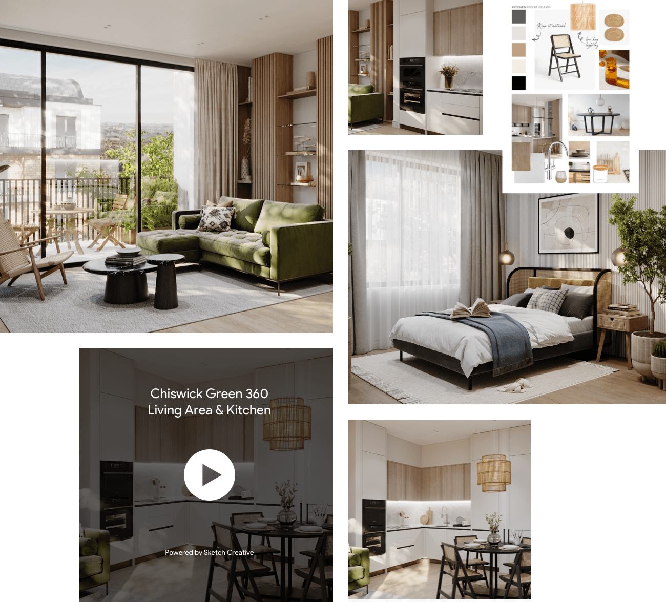 Our CGI team produced the CGI imagery for the properties at Zen's most recent development - "Chiswick Green." Our collaborative moodboard outlined the level of interior we wished to achieve. Once we had done that, our CGI team went away and produced a pixel-perfect representation of the exterior and interior of the property.