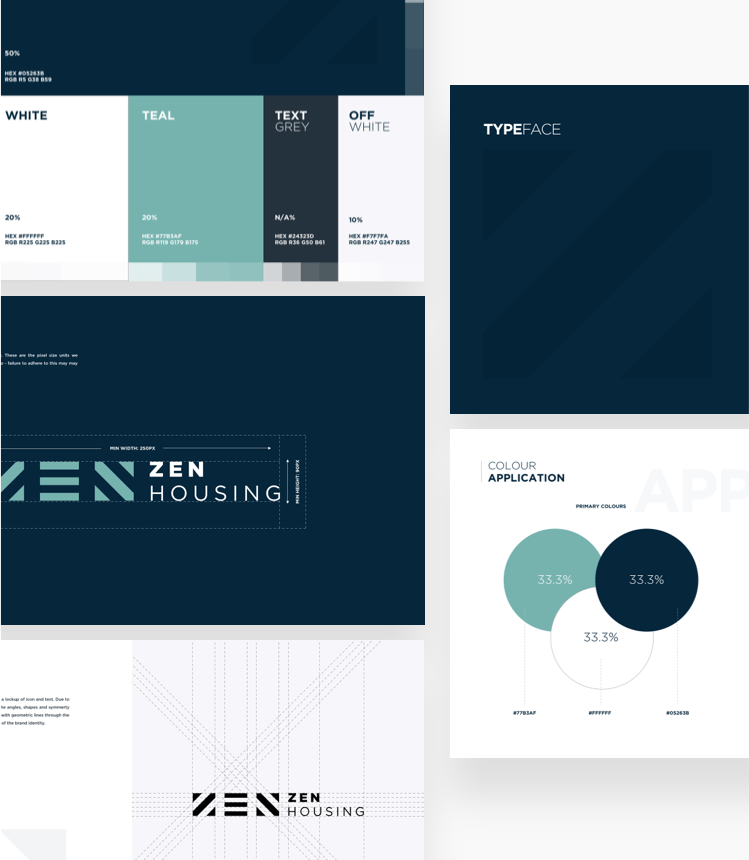 We inherited the Zen Housing brand as a very disjointed identity which didn’t truly reflect the brand positioning and statement. The existing colour palette was made up of earthy tones which held a less formal feel and we didn’t want to completely reinvent the wheel with the brand, but introduce some visual structure.